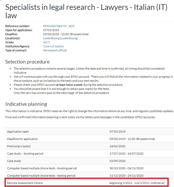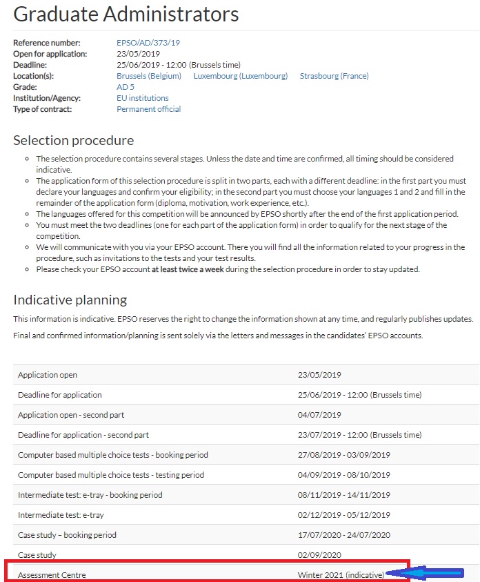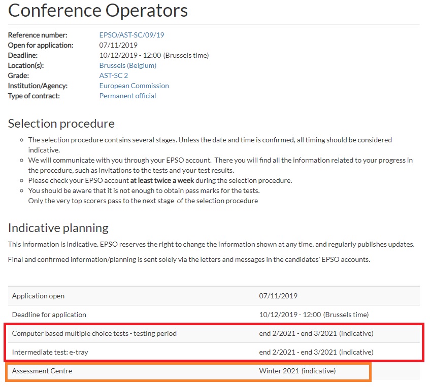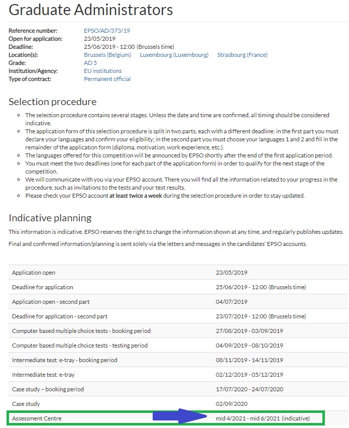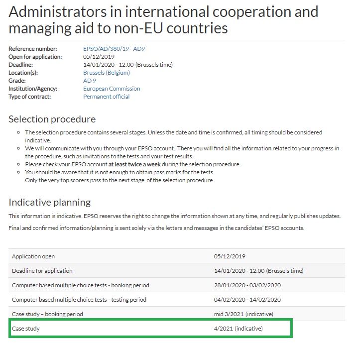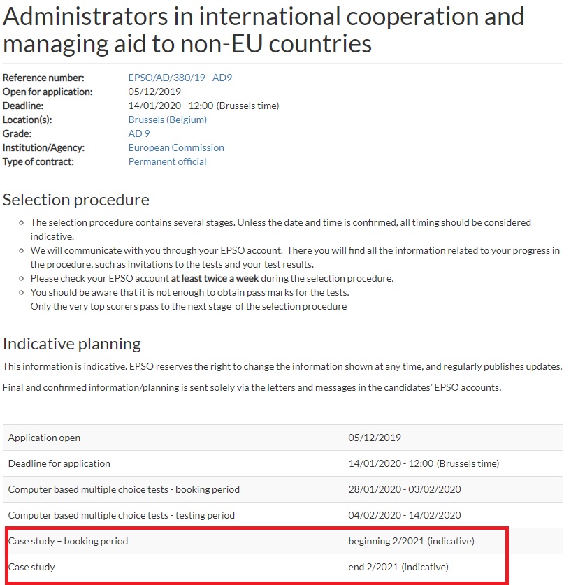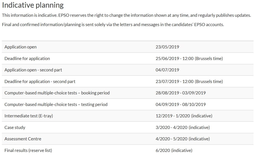This competition is a good example of the evaluation procedure. Applications closed in April, 440 brave candidates presented their application. Around 80 didn’t fulfil the eligibility criteria, so 359 went to the talent, of which 118 are invited now to the assessment that will take place in Autumn. So, it’s time to prepare it! Second half of September will take place the case study (our article on it), then October-November are expected the Competence based interview, field related interview and situational competence interview. If you are interested in our trainings, you can check our next sessions or subscribe for the next ones.