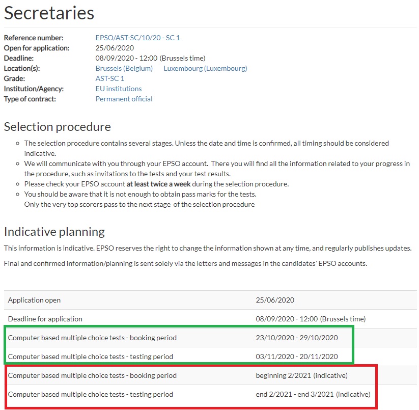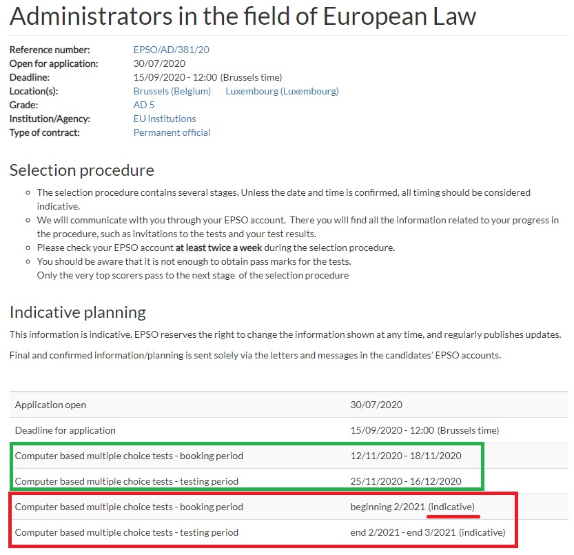 Yes, many of you took the CBT when you were supposed to do so, that is, from end November until mid-December (green square). But still, many (hundreds or even thousands) candidates couldn’t due to Covid-restrictions. In December 2020, EPSO committed itself to give them an opportunity and there it goes (red square). The negative effect of this is that you won’t get your CBT results until all candidates has passed the exam (EPSO said in its 15 December announcement) well…That has been done!!!! We are now facing the EU LAW test (here some free resources and books suggestions) in September, with the linguistic comprehension test. If you think we can help you with the EU LAW test, join our next training, aimed to help you to study during the tempting summer break. .