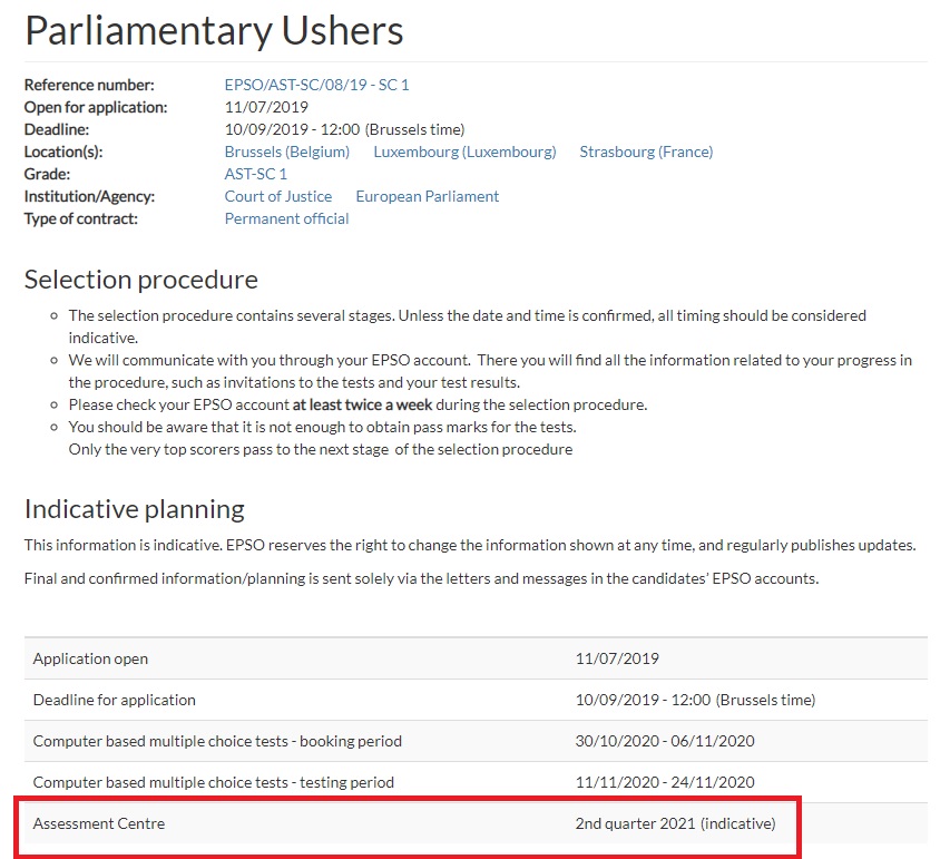 So the CBT is done (according to EPSO last date was 26th July) and let’s hope everybody got its opportunity to take the CBT. Assuming this, results should be ready by September. Then, those successful candidates with the highest marks will jump into CV screening (approx. the first 550 by ranking in marks) and afterwards Talent Screener evaluation from which , a selected group of 165 candidates will be invited to the assessment. Most probably by end of this year to take the assessment beginning of 2022.