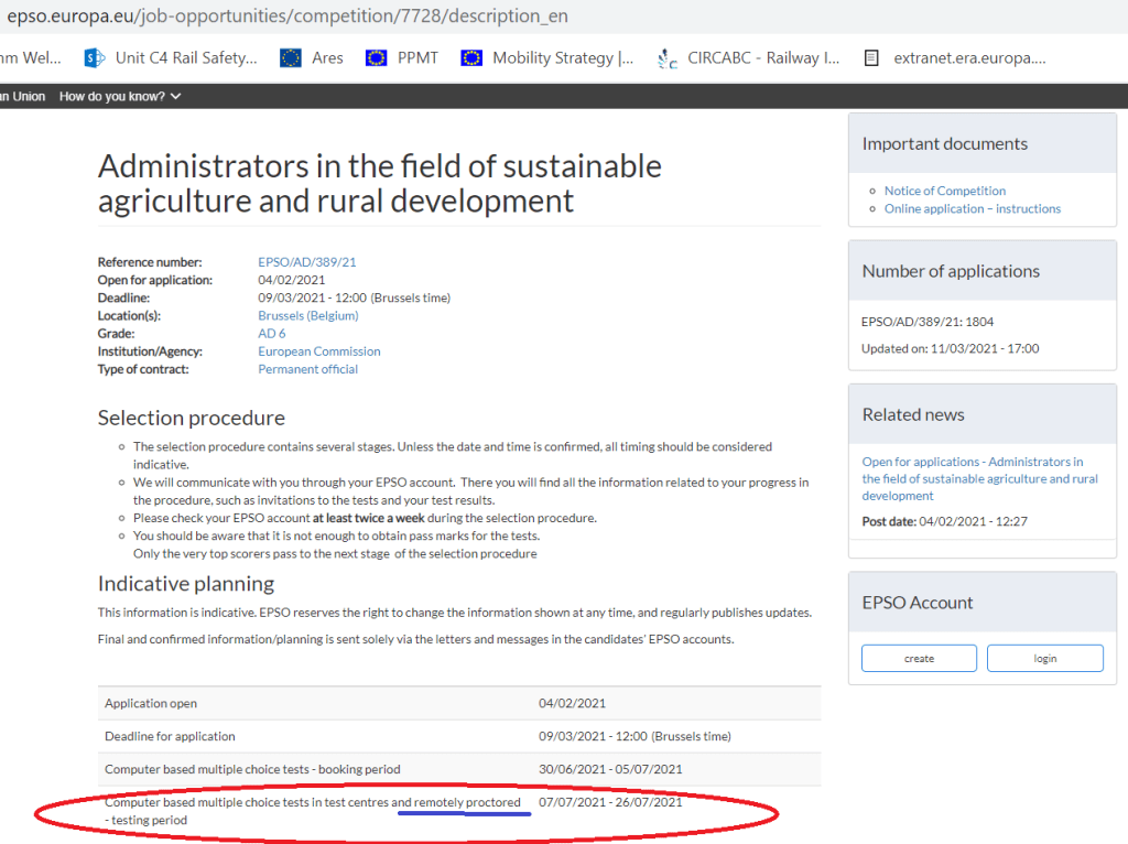 - You have new competitions like Administrators in the field of sustainable agriculture and rural development EPSO/AD/389/21 using the online method for the CBT (so far the experience hasn’t been very satisfactory to the candidates).