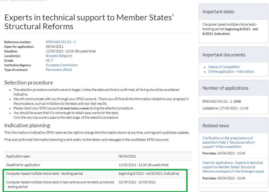 Well, finally the expert in Structural reforms were far more than expected and the CBT has been called upfront and literally while we were writting this, EPSO decided to inform on the dates. the 4th August opens the booking period. CBT exams will take place from 2nd to 10th September. After that, for those of you with the highest marks. Let’s say around 450 , 1 out 4 of the candidates who applied for Structural reform support and around 250 for Schengen acquis, 1 out of 1,5 (not bad, eh??) will go the eligibility check (CV screening) and then to the Talent evaluation, After it, the highest mark in the talent, around 135 for structural reform and 75 for Schengen, will be invited to the assessment (end 2021 or most likely beginning of 2022) . If you think we can help you with our trainings, you can check our next sessions or subscribe for the next ones.